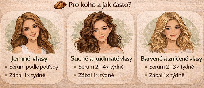- Na co si dát pozor: Nejčastější chyba je příliš velká dávka (zplihnutí). Pokožku hlavy olejuj jen při suchosti a po otestování snášenlivosti; při alergii na ořechy raději opatrně nebo vůbec.